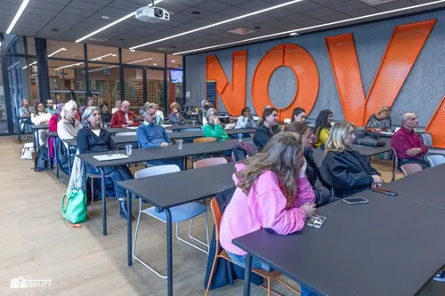 studenten en taalbuddy-vrijwilligers in een zaal van het Nova College, waar