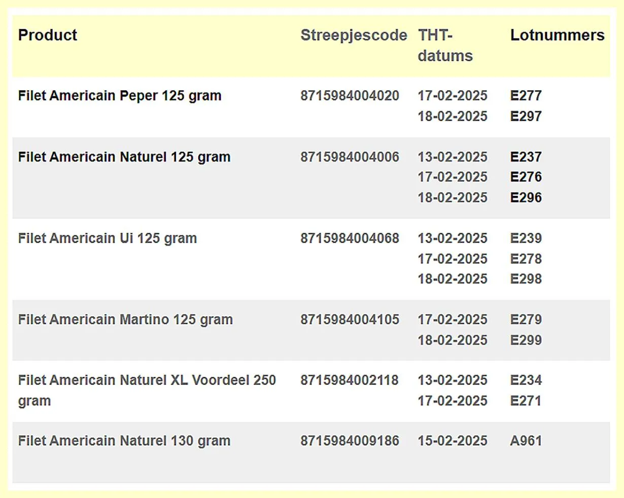 Als u filet americain van Ladesse heeft gekocht, controleer dan goed de houdbaarheidsdatum en het lotnummer. Als deze overeenkomt met een in de tabel genoemde datum of code, eet deze filet americain dan niet!