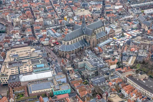 Hieronder de kathedrale basiliek Sint-Bavo aan de Leidsevaart en Westergracht. Onderaan de foto werkzaamheden aan 'Plaza West' het inmiddels qua bouw ver gevorderde winkel- en wooncentrum