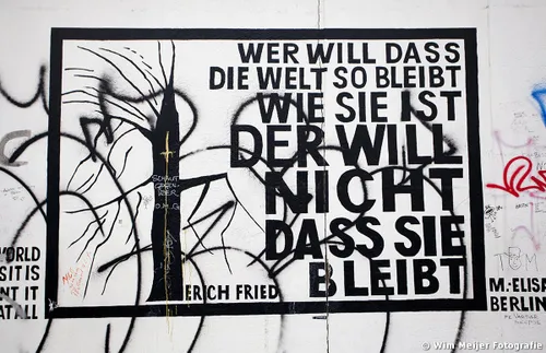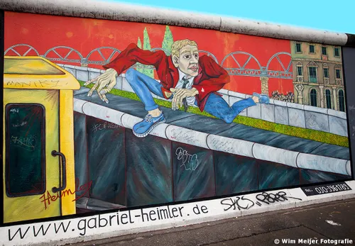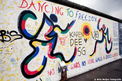 Hieronder een fotoserie van een deel van de Berlijnse Muur: de East Side Gallery , een stuk van de Berlijnse Muur met een lengte van 1.316 meter, in 1990 beschilderd door 118 kunstenaars uit 21 landen. De kunstenaars gaven in de schilderwerken hun visie op de politieke situatie in het Berlijn van 1989/1990. Inmiddels is de Side Gallery de grootste permanente openluchttentoonstelling ter wereld en is een verzoek ingediend om het op te nemen op de werelderfgoedlijst van UNESCO.