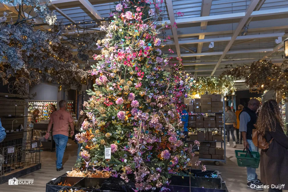 Waarom al zo vroeg? Eigenlijk beantwoordt u zelf die vraag met uw massale bezoek, want die betoverende Kerstshows worden vanaf de opening medio oktober enthousiast door jong en oud bezocht. We dompelen ons onder in een Sprookjeswereld van elfjes, feeën, kabouters en...we blijken al vroeg opzoek naar Kerstartikelen die straks bijdragen aan een sfeervolle huiskamer. Nog mooier dan vorig jaar!  Sommigen creëren thuis een mini Kerstdorp met Alpen, skibanen, treintjes en nog veel meer. In elk geval is bijna iedereen op zoek naar inspiratie voor het aankleden van de Kerstboom, die al jaren niet meer uitsluitend wordt versierd met Kerstballen, slingers en kaarsjes. Een voorbeeld hieronder, Kerstboom versierd met bloemen.