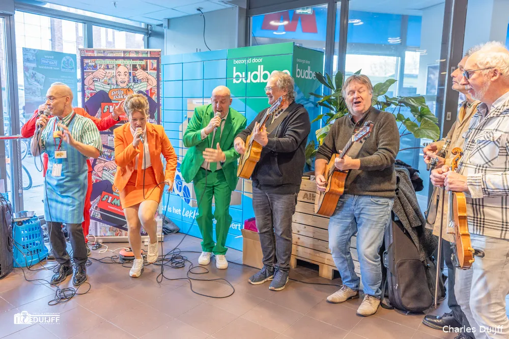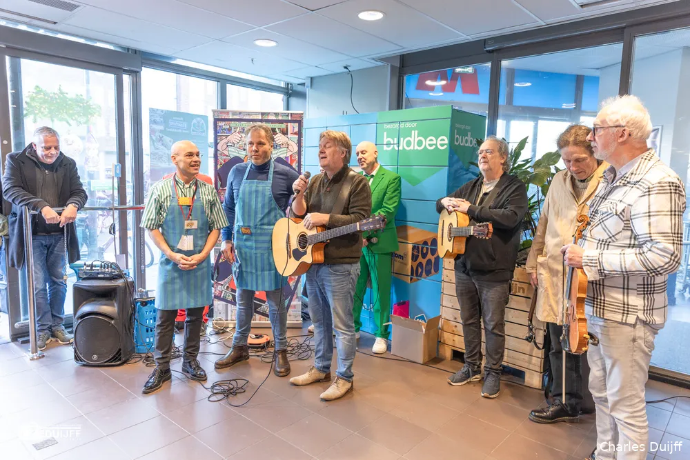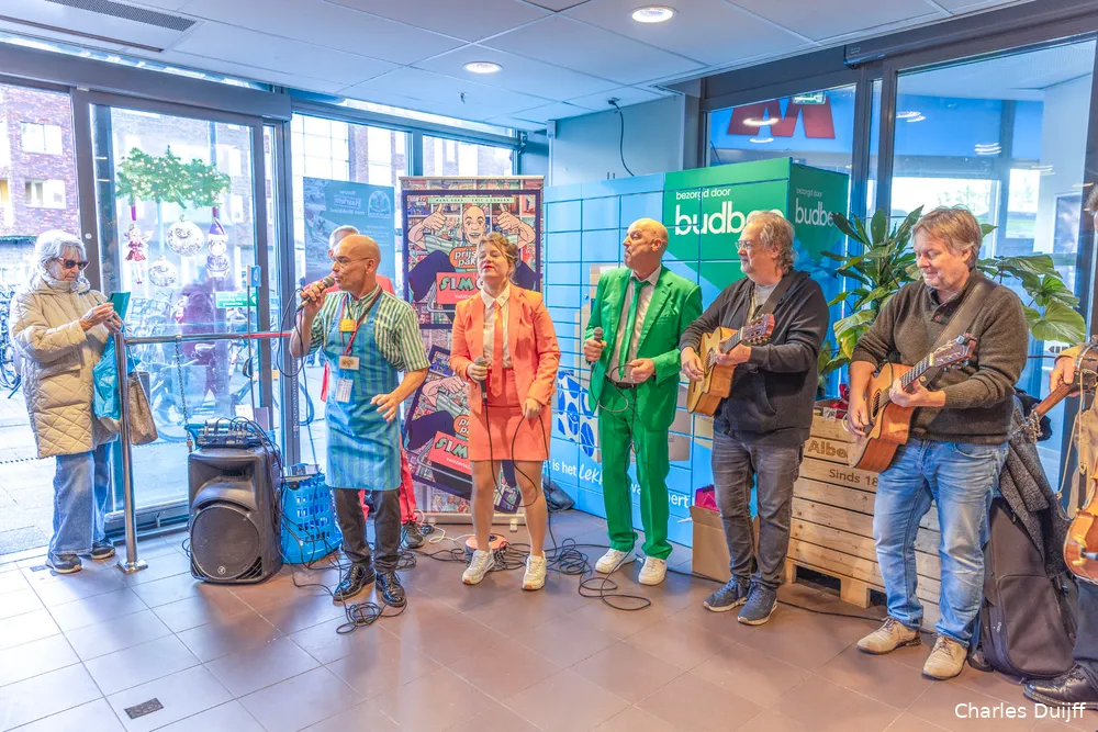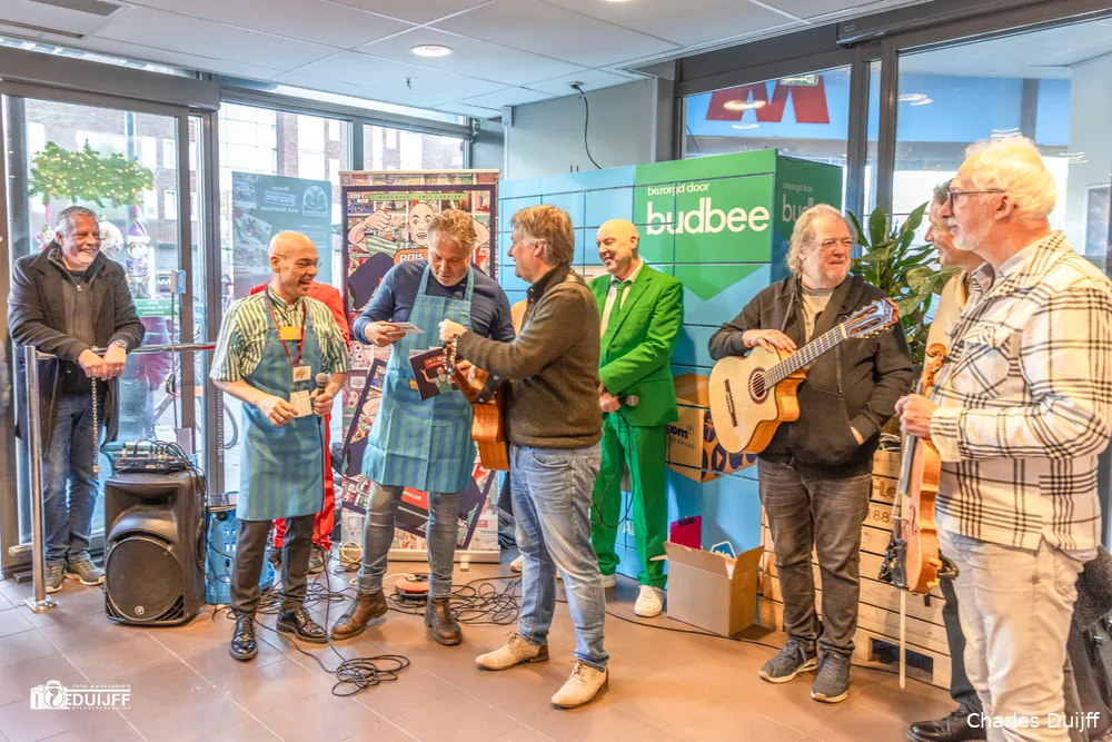 Dit keer was Simon, die we allemaal stiekem kennen als 'bekende Haarlemmer (BH-er)' Hans Goes, zaterdag 13 december niet alleen aanwezig om vakken te vullen! Simon liet het winkelend publiek en genodigden horen, dat hij ook verdienstelijk kan zingen en misschien wel een 'hit' te pakken heeft. Er bestaat altijd 'een supermarkt' voor lekkere swingers en meezingers. Simon werd vocaal bijgestaan door het Trio Vierstemmig. Daarnaast freubelden de 'Haarlemse jongens' van het Haarlemse Ampzing Genootschap 'zo maar wat af'