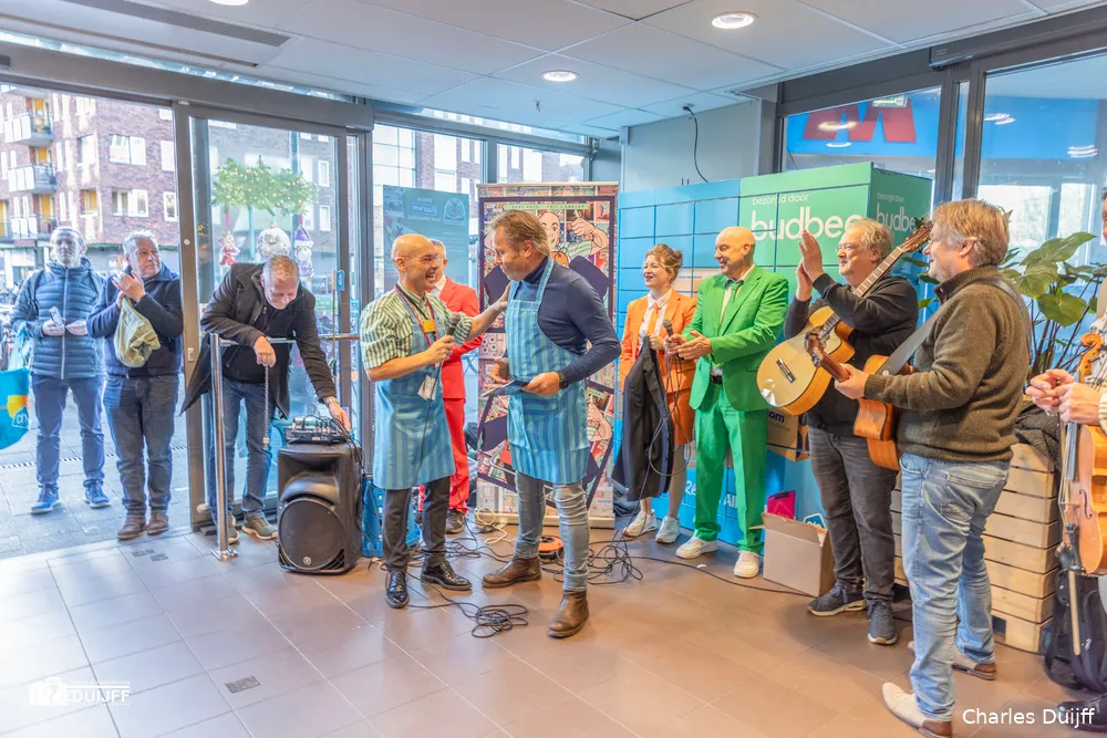 Simon (hieronder L) heeft heel wat in zijn mars, dus zeker op het Marsmanplein bij de Albert Heijn ging hij helemaal los. In het midden Han Bouwens, ondernemer van AH Marsmanplein en rechts tekenaar Eric J. Coolen.