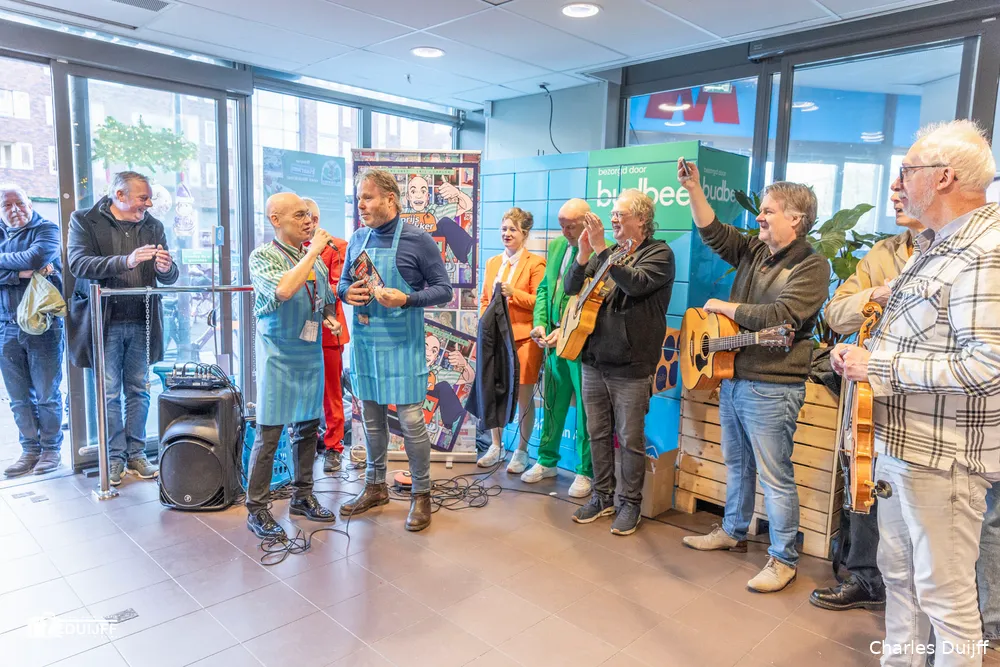 Het eerste exemplaar werd op ludieke wijze gepresenteerd en overhandigd aan Han Bouwens, die het boekwerk mede mogelijk heeft gemaakt. Muziek van Simon met Trio Vierstemmig zorgde zelfs voor polonaise in de Albert Heijn op het Marsmanplein en ook het Ampzing Genootschap trad op! Bekijk ook de filmpjes verderop in dit artikel. Hieronder AH-ondernemer Han Bouwens in de 'Klare Lijn'