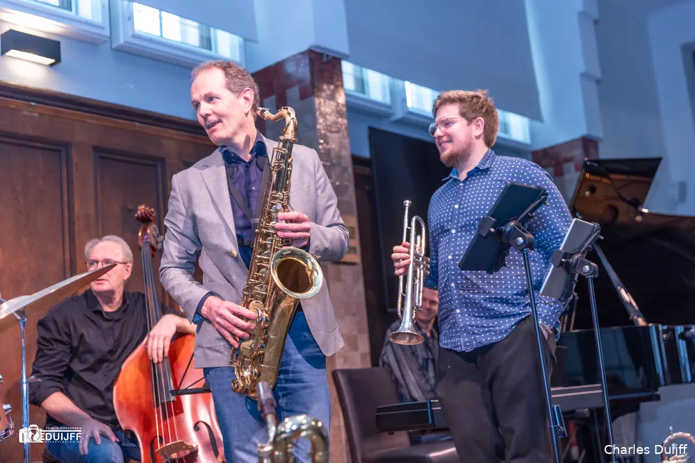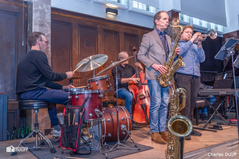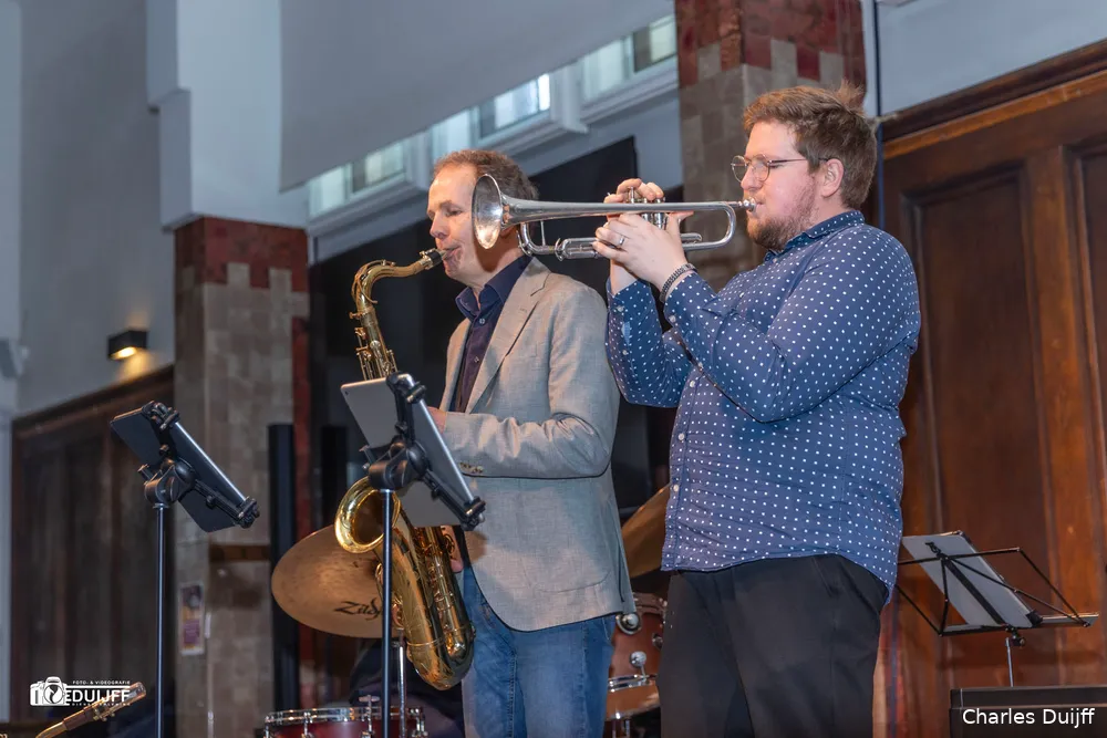 Maar liefst twee voorstellingen konden we bijwonen in hetzelfde gebouw, want na swingende salsa-dans was het tijd voor de jazzmuzikanten van JAZZO, een geolied jazzkwartet, voor deze gelegenheid aangevuld met de virtuoze trompettist Laurens van der Zwaag. De vaste band-leden van JAZZO zijn Gaby Agsteribbe piano, Reinier Pollmann saxofoon, Peter Burgers drums en Lenny Fleer op bas. Het is een kwartet met vier ervaren en goed op elkaar ingespeelde jazzmuzikanten. Een Jazz-tendem zou je kunnen zeggen. Latin jazz, hardbop en modale jazz worden afgewisseld met ballads. Improvisatie is daarbij het kernwoord. Door goed naar elkaar te luisteren en op elkaar in te spelen, ontstaan verrassende wendingen in de muziek. Trompettist Laurens van der Zwaag genoot zichtbaar van het samenspel.