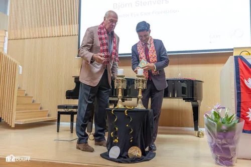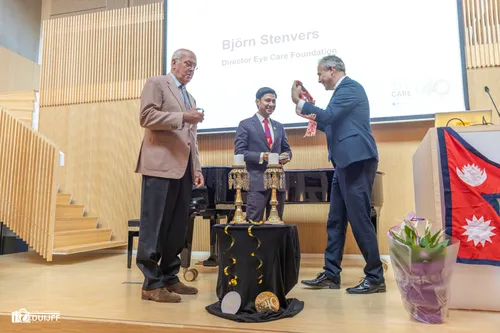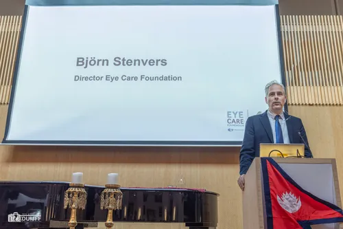 Vaak door het opleiden van artsen ter plekke, het verstrekken van goede brillen en het uitvoeren van simpele staaroperaties zijn oogziekten vaak simpel te genezen. Oogarts Gerard Smith, één van de Bloemendaalse oprichters, vertelde aan de circa honderd aanwezigen in het gemeentehuis hoe de stichting in 1984 haar activiteiten startte. Tevens vertelde hij over de ontwikkelingen in de oogzorg wereldwijd in de afgelopen 40 jaar en de veranderende rol van de oogarts in de landen waar de stichting actief is. Eye Care Foundation is in 1984 opgericht op initiatief van Nederlandse oogartsen en verpleegkundigen. De eerste oogkampen in Nepal werden jarenlang door de Nederlanders geleid vanwege het gebrek aan gespecialiseerde artsen in dit land. De Nepalezen moesten voor bijvoorbeeld staaroperaties hun heil zoeken in India. In 1986 werd dankzij een sponsoractie in Nederland en Japan het eerste oogziekenhuis geopend in Sitapur, de tweede stad van Nepal. Hieronder Gerard Smith