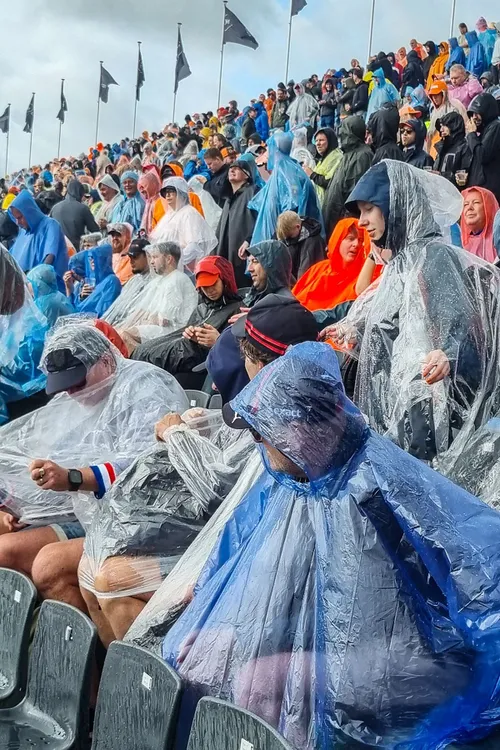 zovele poncho’s in de stromende regen. Ondanks dat werd er op en rond de tribunes